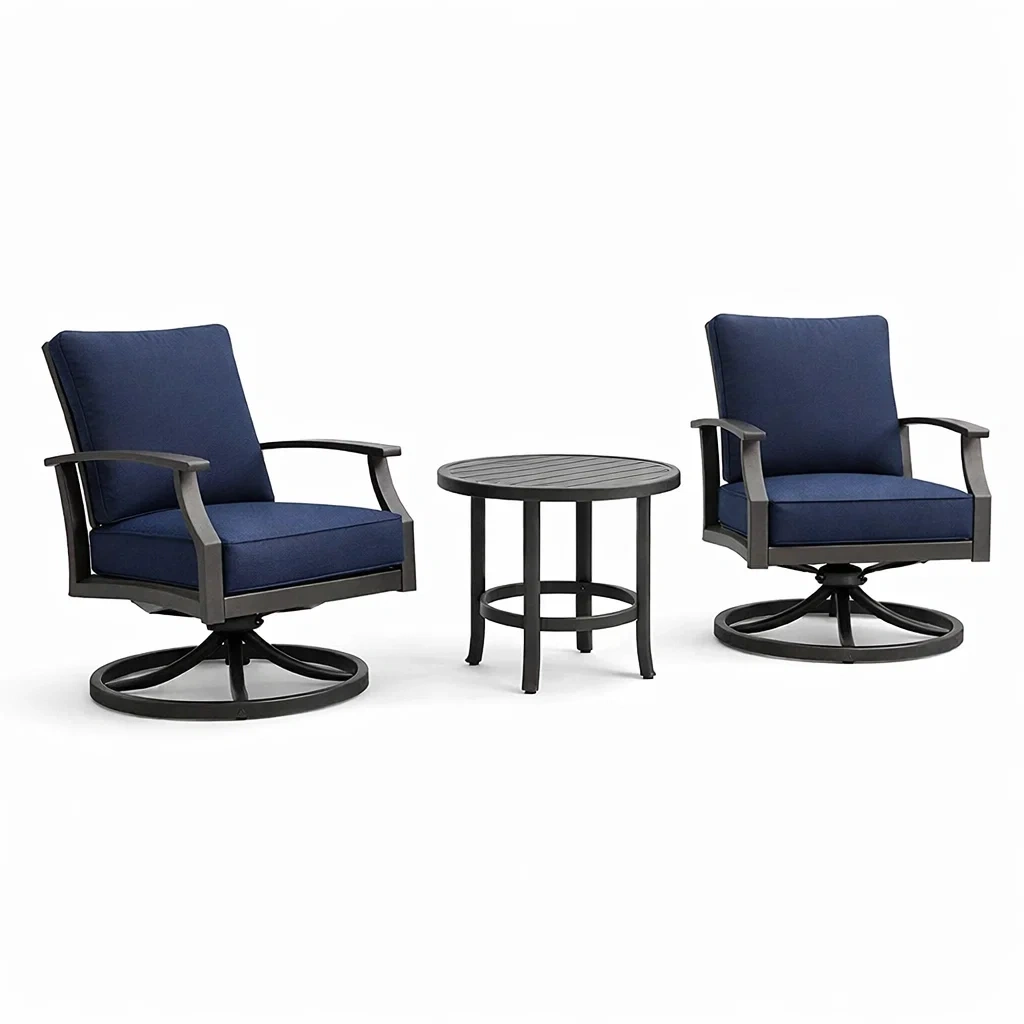 Ensemble de détente en métal avec fauteuils pivotants table ronde et coussins bleu