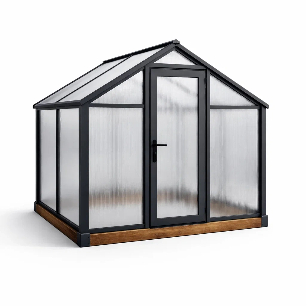 La serre est principalement fabriquée avec un cadre en aluminium et des panneaux en polycarbonate de 6 mm offrant une excellente durabilité. La base est en bois pour une stabilité supplémentaire.